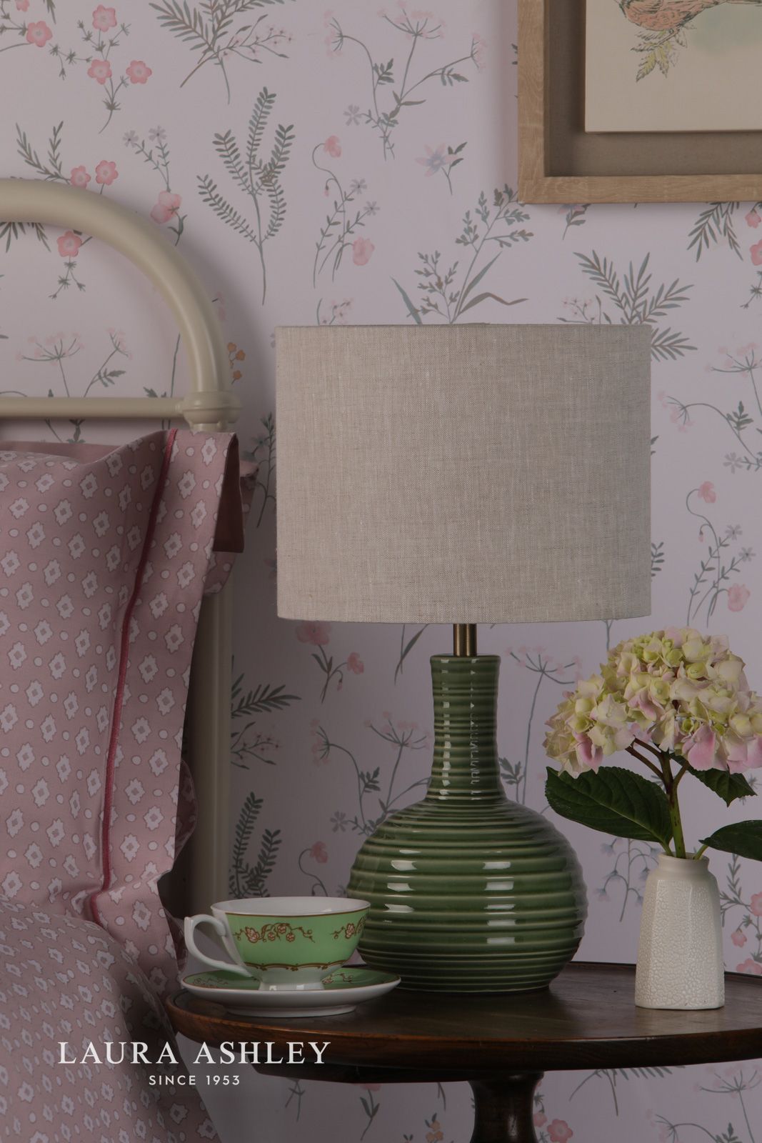 The Padley Table Lamp by Laura Ashley features a rippled ceramic base in a glossy transparent glaze in deep green. Paired with an oatmeal fabric lampshade that creates a warm glow of light, so you can set up the perfect ambience in your space. Bulbs not included; takes 1 x 40W Max SES.