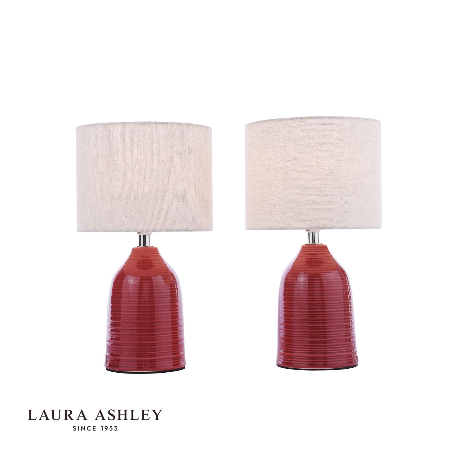The Penny Table lamps from Laura Ashley are the perfect set for the bedroom, a long console or dresser. In a simple bottle shape, each lamp comes complete with a natural oatmeal linen shade. The rosewood red glaze has a very subtle crackle glaze effect. With hand-carved horizontal ribbing, these versatile lamps can be used all around the home.