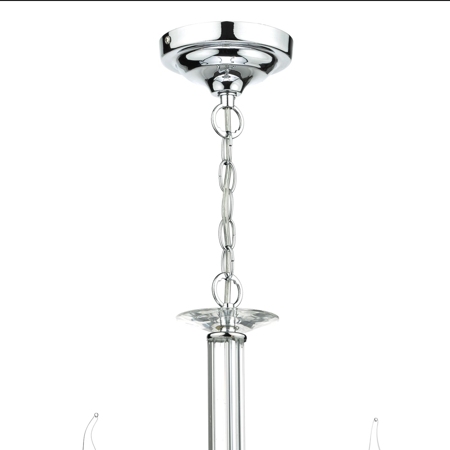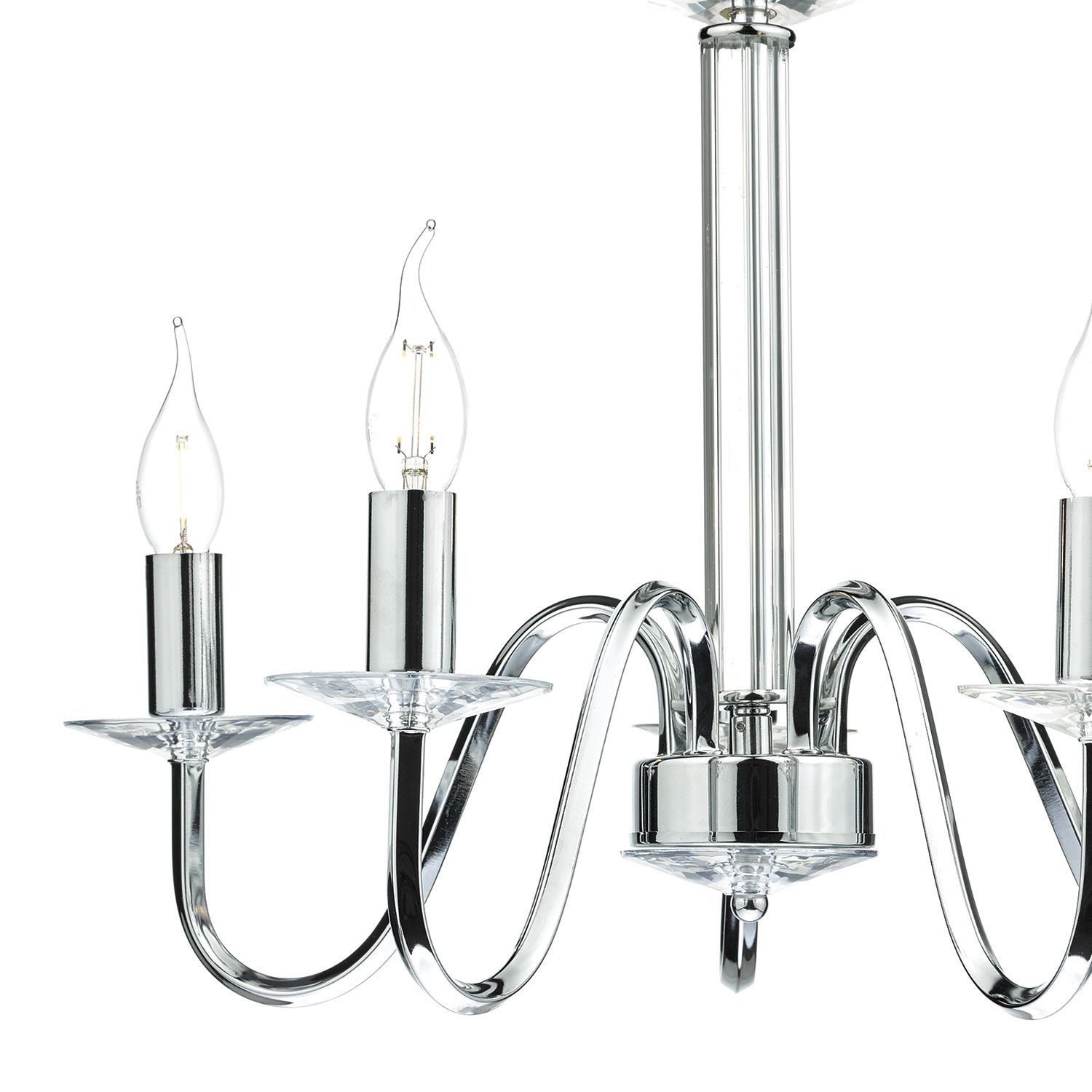 PIQUE - Contemporary styled 5 light fitting with a graceful curved polished chrome arm and gleaming glass scones and a clear acrylic centre rod to reflect the light and add sparkle. The fitting is height adjustable on installation. This ceiling light looks great with a decorative lamp but also can be used with a shade to add a splash of colour or tie into any décor styling.