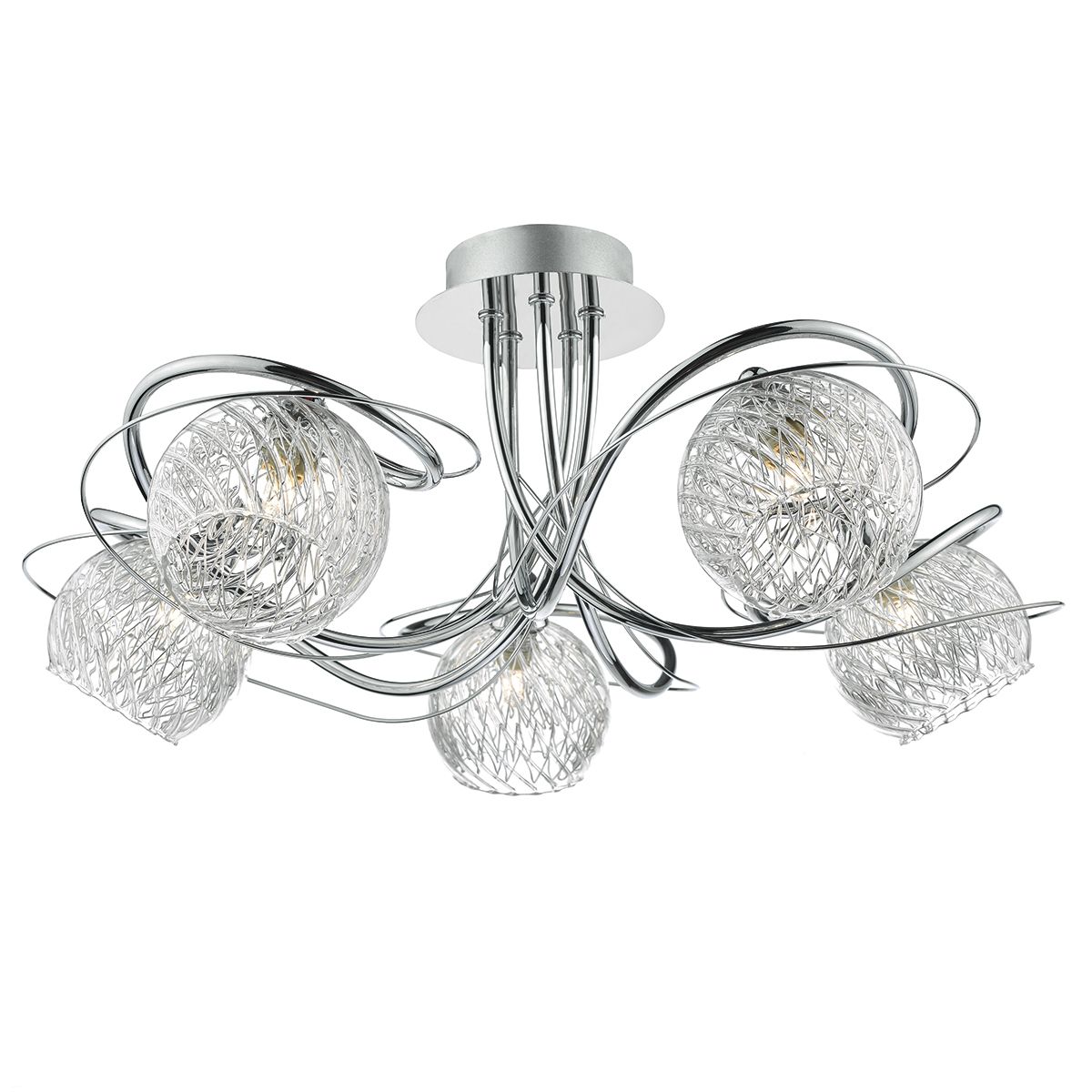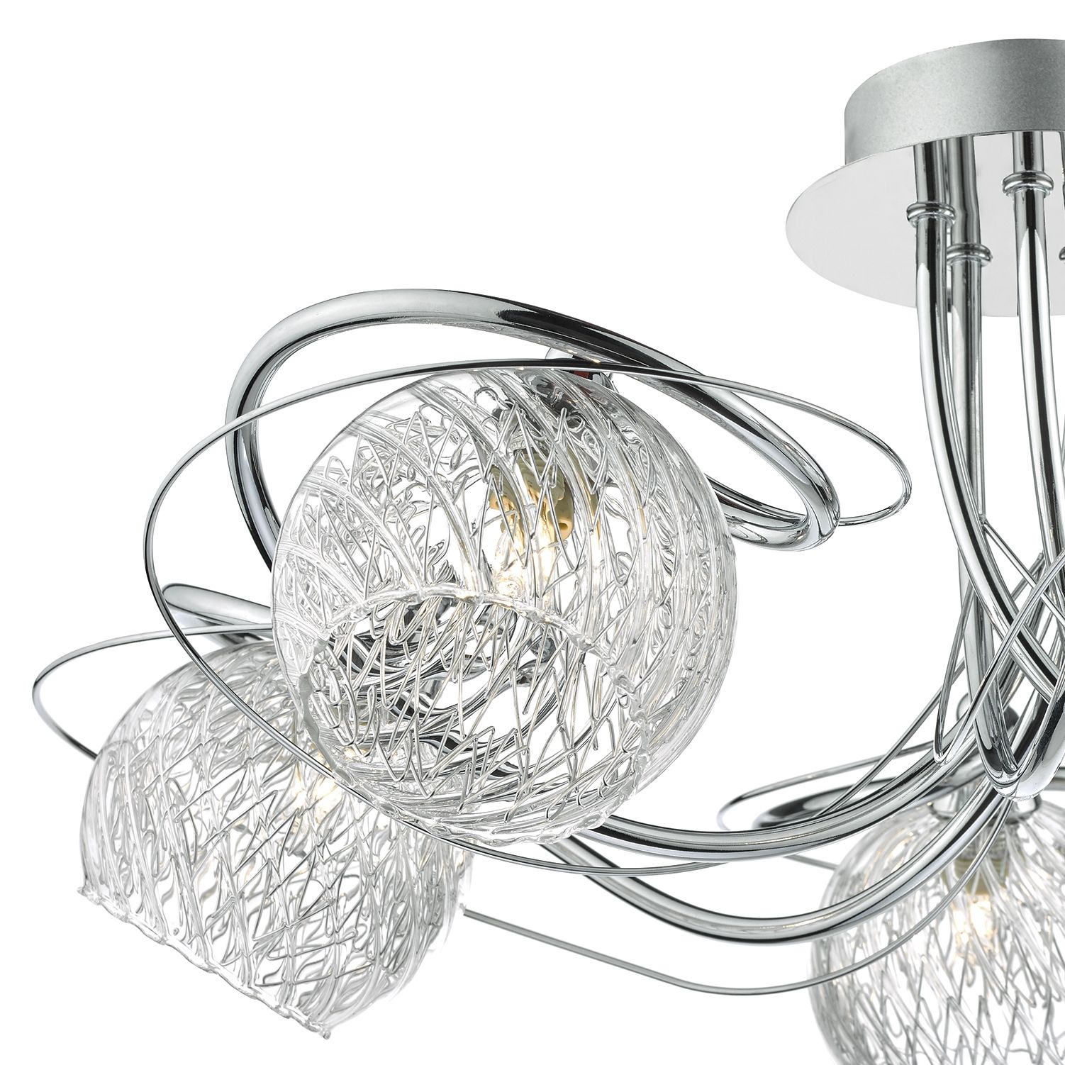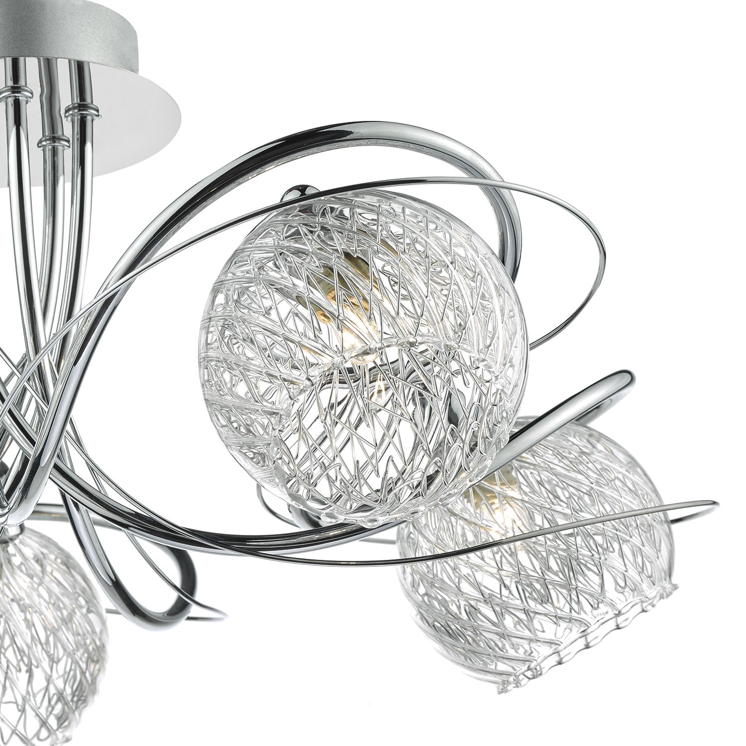 The Rehan Semi-Flush casts a warm, inviting glow with its five ribbed glass shades inlaid with delicate wire detailing. Its sculptural curved arms form an eye-catching centrepiece ideal for lower ceiling heights. Polished to a brilliant chrome finish, this sleek semi-flush design seamlessly complements both modern and traditional decor styles, lending a sophisticated touch to any living space, dining room or entryway.