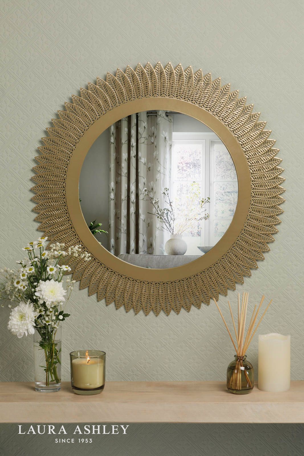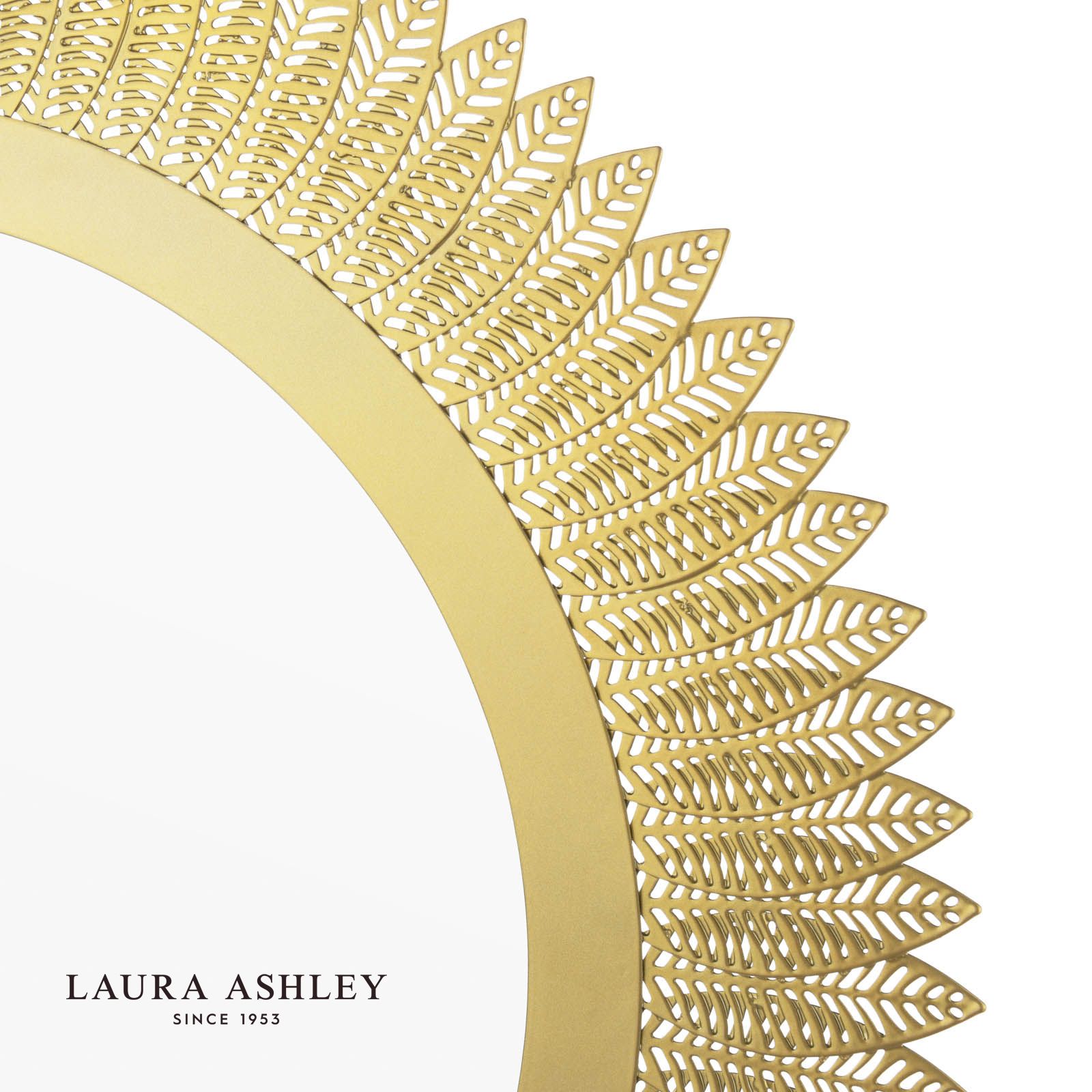 Add a touch of nature-inspired elegance to your walls with this stunning Laura Ashley mirror. The round silhouette is beautifully adorned with delicate metal leaves in a sophisticated brushed gold finish, creating a subtle shimmer that catches the light just so. This mirror does more than just reflect - it's a statement piece that brings both function and artistry to any room. Laura Ashley's signature attention to detail shines through in every carefully crafted leaf, while the classic round mirror at the centre offers a perfect view for last-minute outfit checks or brightening up darker corners of your home. Whether gracing an entryway, bedroom, or living space, this decorative mirror transforms blank walls into sophisticated focal points.