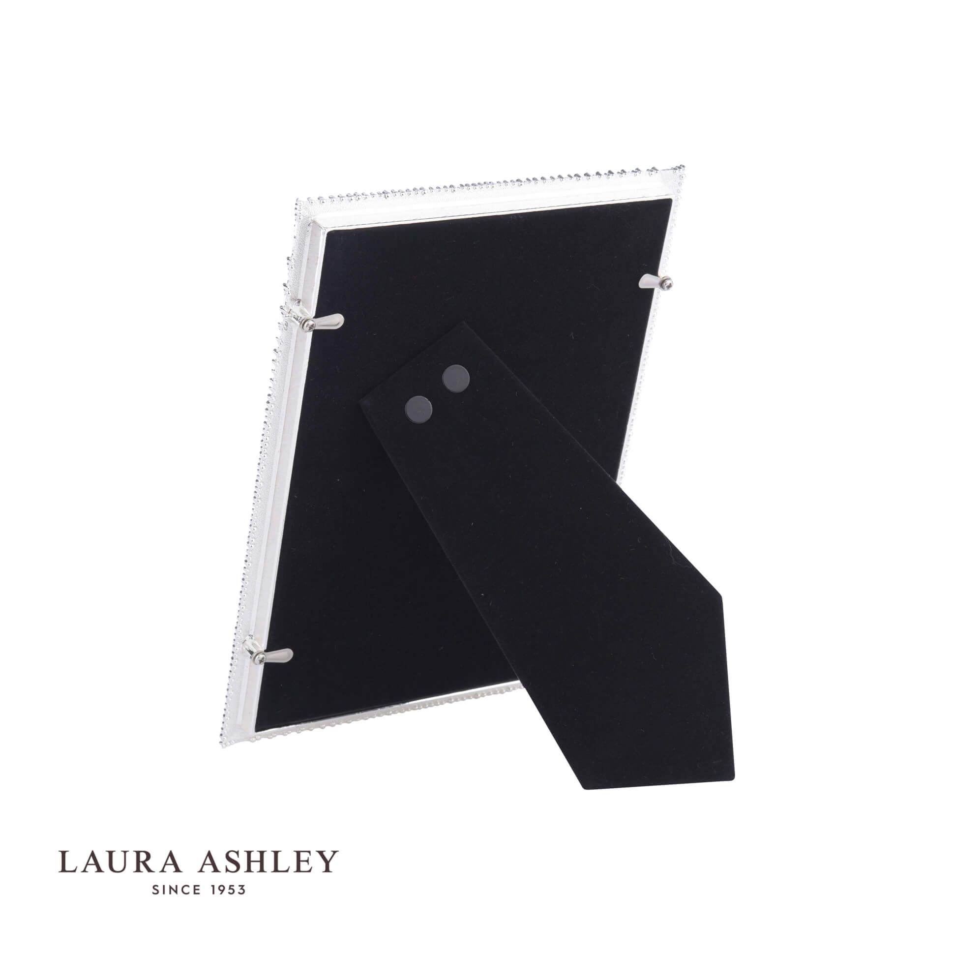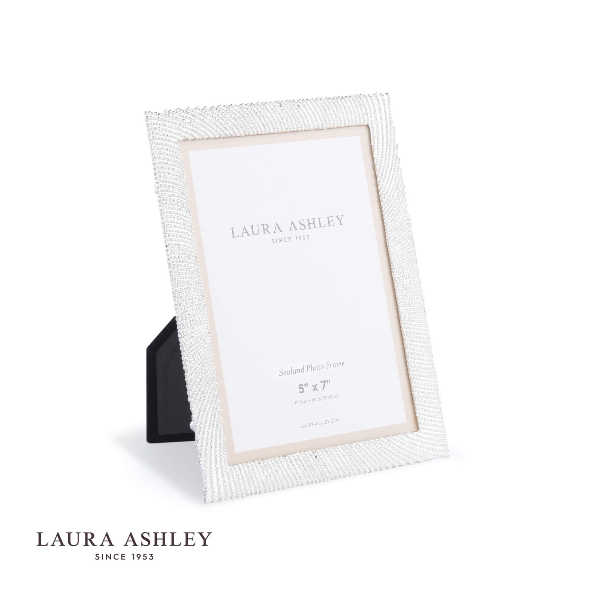 With a shiny, silver-plated frame decorated with curving rows of tiny beads, the Cromer photograph frame from Laura Ashley has a subtle beauty. Holds one photo. Free standing, for both portrait or landscape orientation. Silver-plated metal frame, glass fronted, with a black velvet backing.