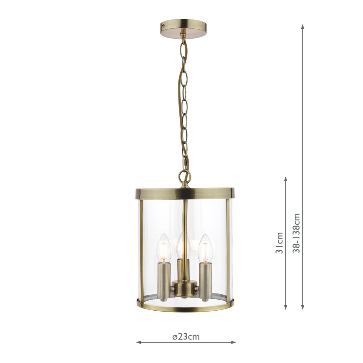 This ceiling pendant fitting has a matching finish ceiling rose and hanging chain plus a coordinating gold cable. Height is adjustable at the point of installation (38–138cm).