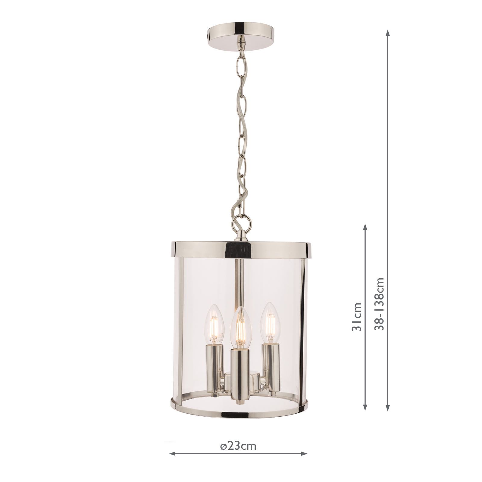 This ceiling pendant fitting has a matching finish ceiling rose and hanging chain plus a discreet clear cable. Height is adjustable at the point of installation (38–138cm).