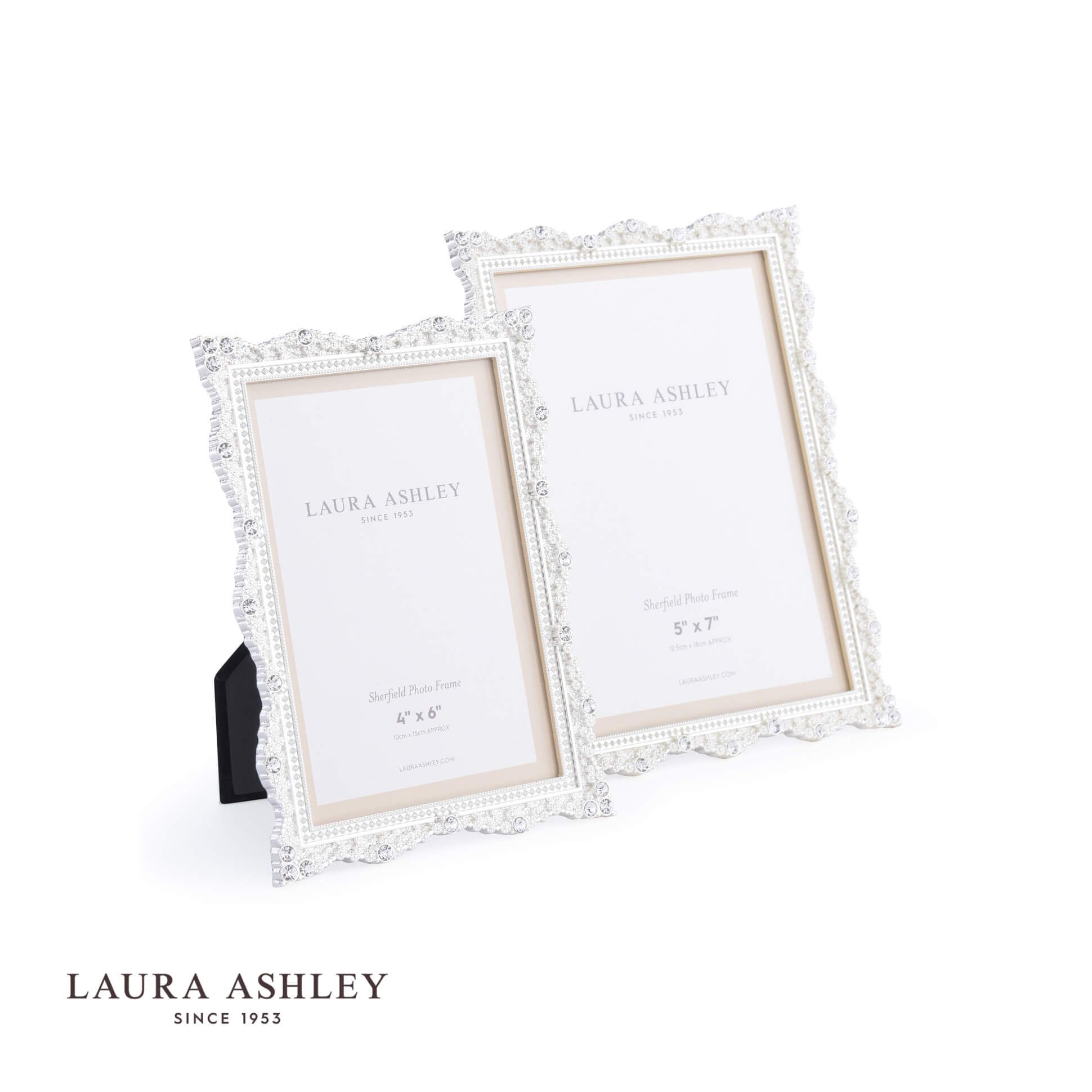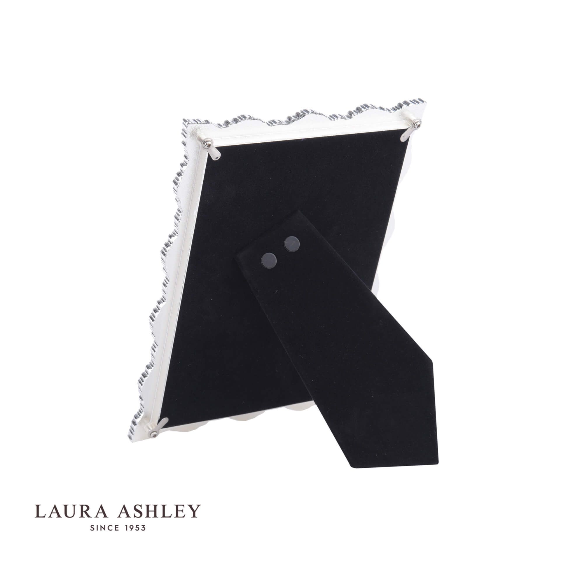 An ornate frame for those special occasions, the Sherfield photograph frame from Laura Ashley will make a statement in more traditional interiors. Holds one photo. Free standing, for both portrait or landscape orientation. Silver-plated metal frame, glass fronted, with a black velvet backing.