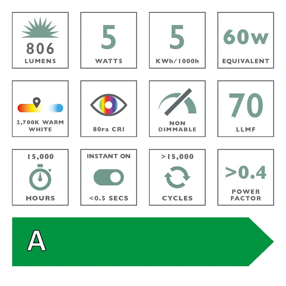 This LED GLS bulb by Dar Lighting consumes just 5W of electricity, making it a highly energy-efficient alternative to a traditional incandescent bulb. The bulb is non-dimmable, so incompatible with dimmer switches and touch lamps.