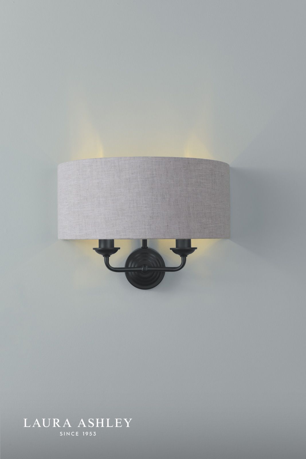 This chic Laura Ashley Sorrento Wall Light features two lights encased in a single contemporary drum shade in a natural slubbed linen with a metallic silver inner. The two light wall light comes in a painted black finish, adding a sophisticated atmosphere to your dining or living area.