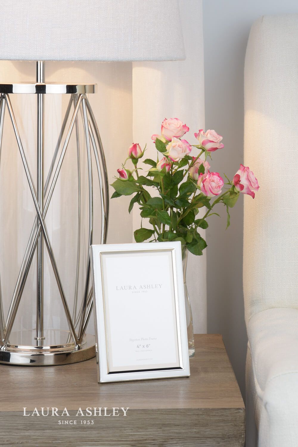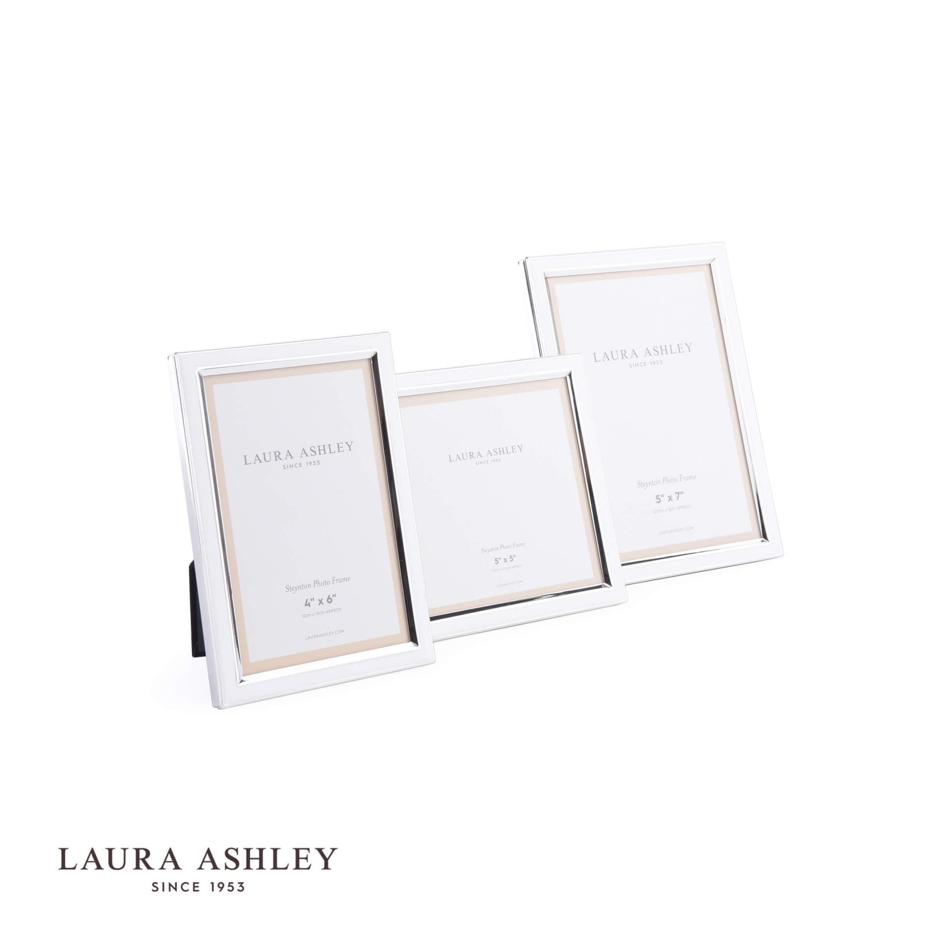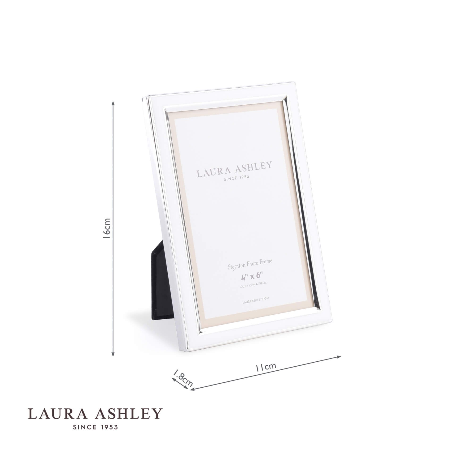 From Laura Ashley, the Steynton photograph frame has a classic elegance that will grace any room. A smooth and glossy white border is bounded by silver, ensuring the focus is on the faces within. Holds one photo. Free standing, for both portrait or landscape orientation. Silver-plated steel and resin frame, glass fronted, with a black velvet backing.