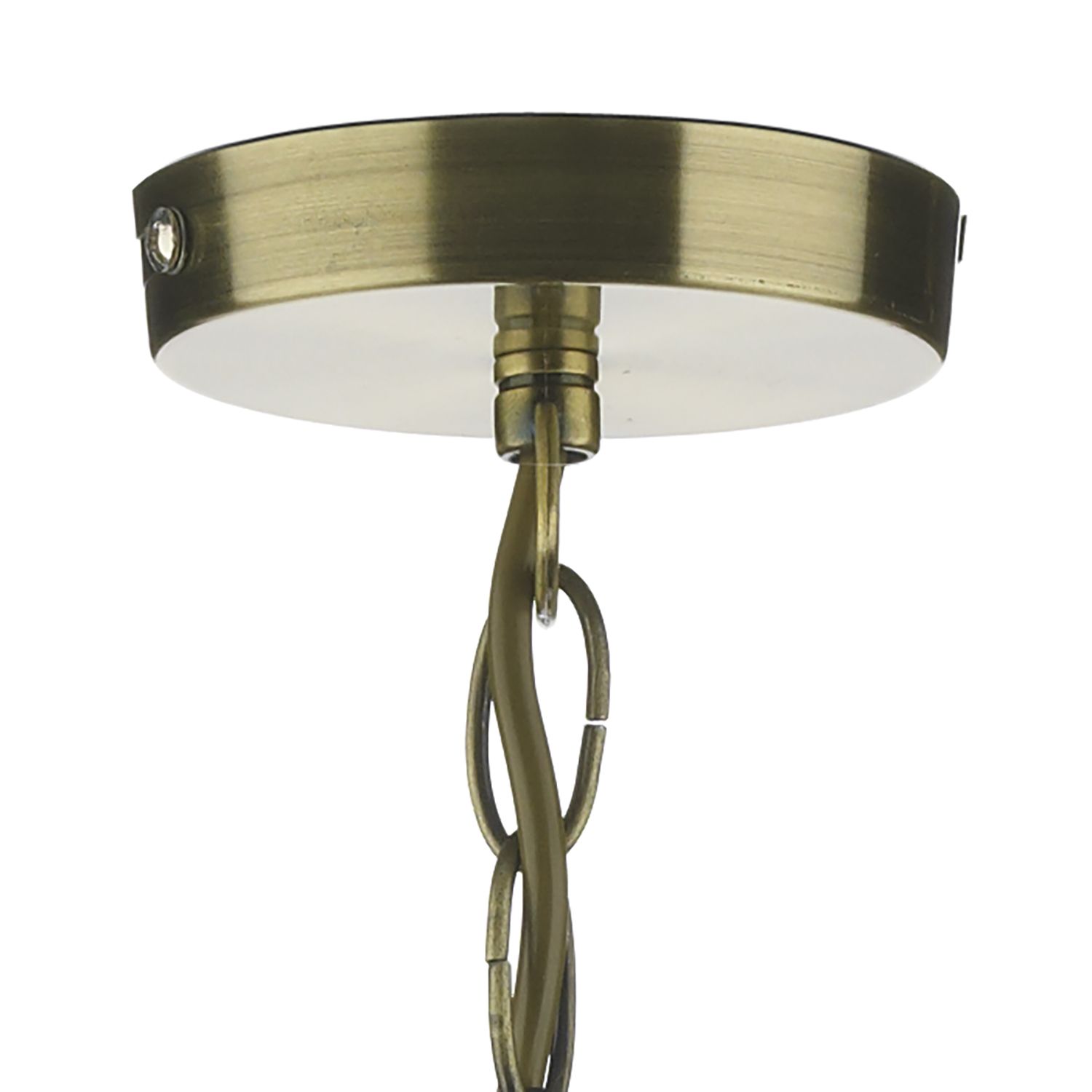 Suspended on a matching antique brass chain, with a discreet clear cable. Height is adjustable at the point of installation to a minimum of 42cm (max 78cm).