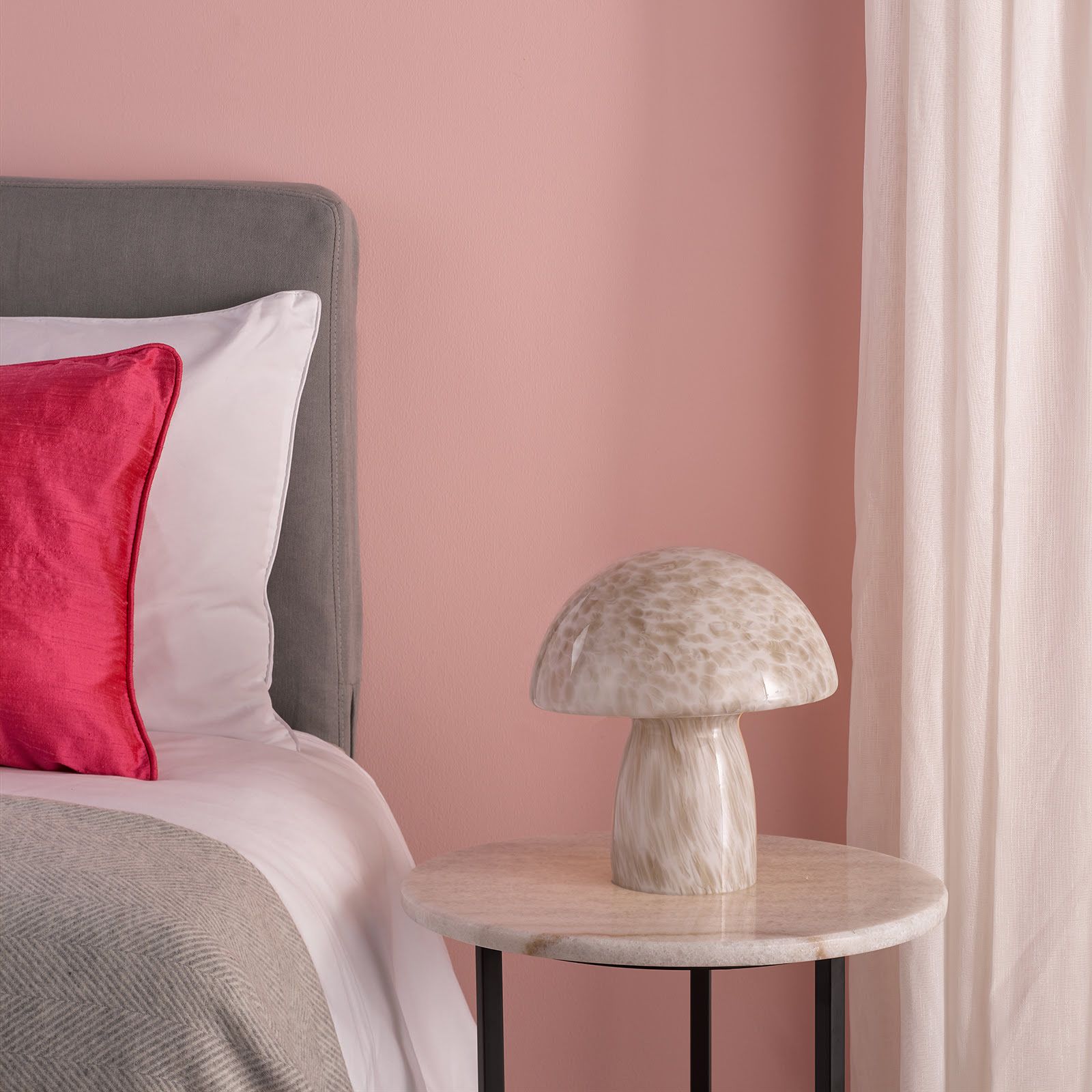 The Addie Mushroom Table Lamp is here to sprinkle some magic into your space. This charming bedroom light features a trendy mushroom shape that's all the rage in interior design. Crafted from white and grey confetti glass, it's a visual treat even when switched off. When illuminated, this table lamp casts a soft, dreamy glow, perfect for creating a cozy atmosphere in your boudoir. Whether you're winding down with a good book or looking to add a touch of playful style to your room, this quirky lamp is sure to be a conversation starter.