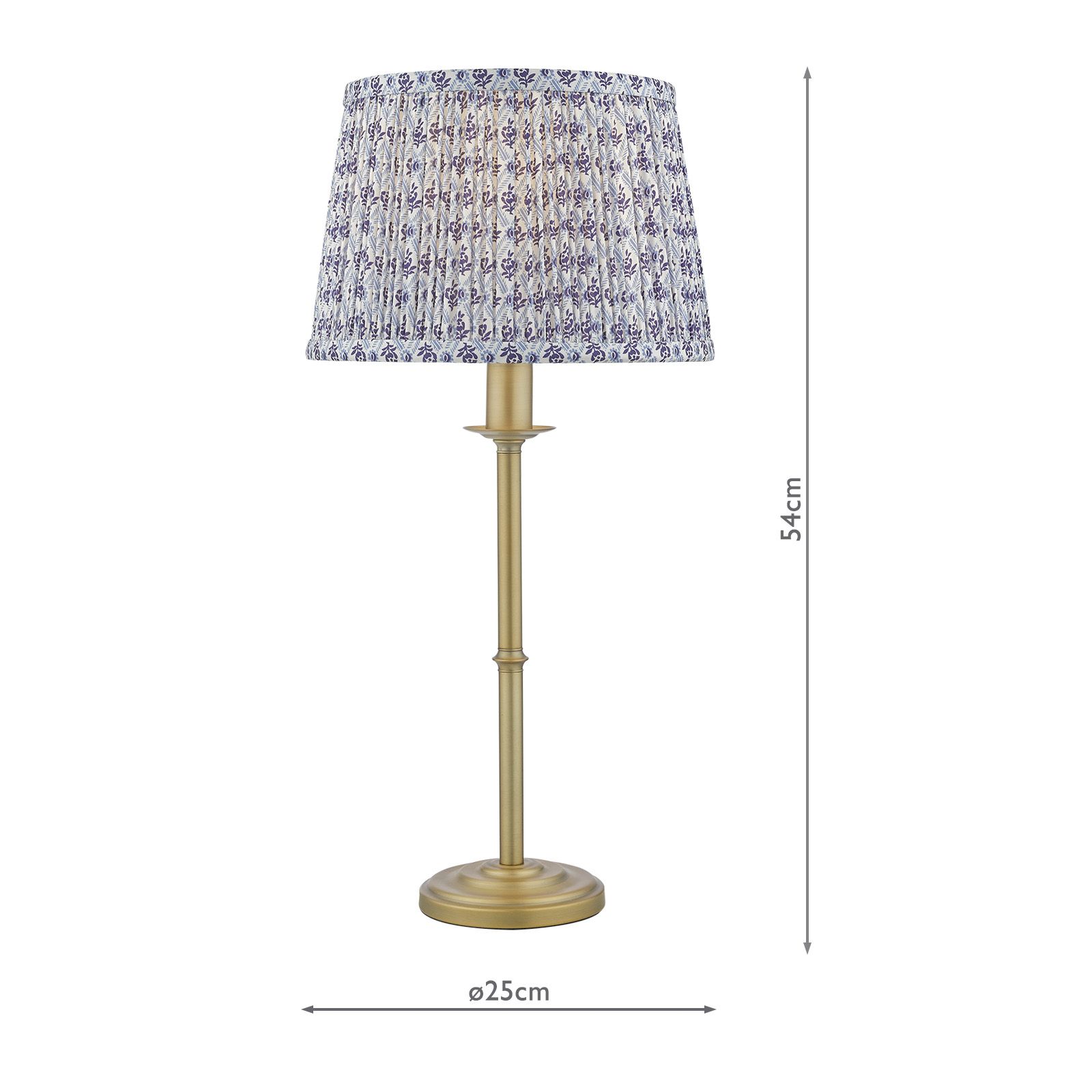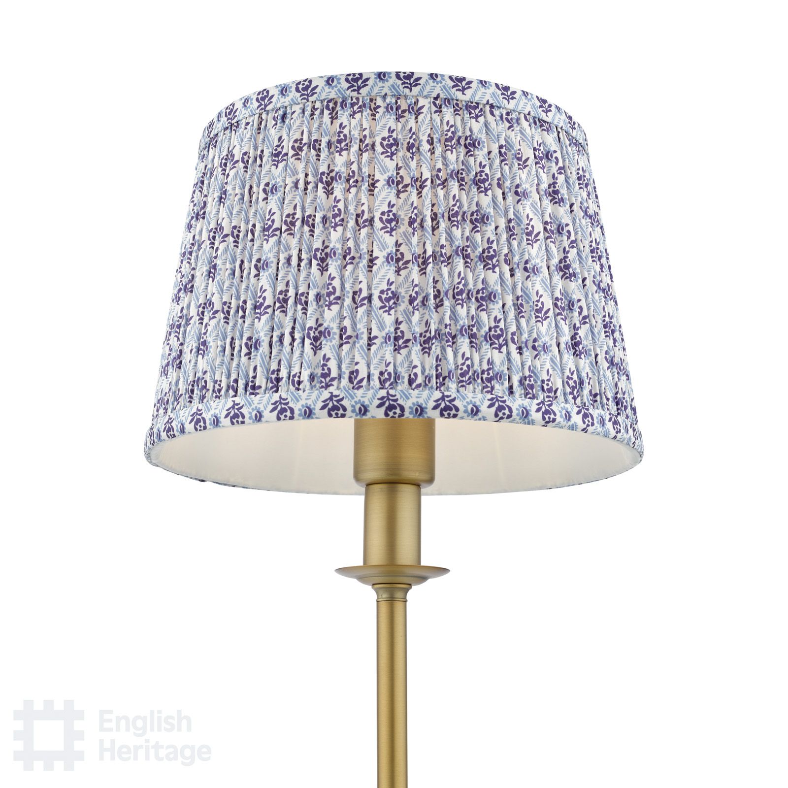 Part of the English Heritage lighting collection, inspired by Great British houses and gardens. Marble Hill Single Table Lamp in Aged Brass is an exercise in Georgian proportions inspired by Marble Hill itself. Sold complete with our St. John Street pleated shade in blue. Looking stunning in the hallway, bedroom or dining room, this elegant single table lamp is versatile and can be used in most rooms in the house. The authentically aged brass finish is a multi-stage process involving brass plating, chemical oxidising and hand rubbing before finally finishing with a protective lacquer. The Marble Hill single table lamp features a cable-mounted rocker switch for ease of use. The Marble Hill range consists of a 3 and 5 light pendant, wall light and table lamp, all in two authentic historic finishes.