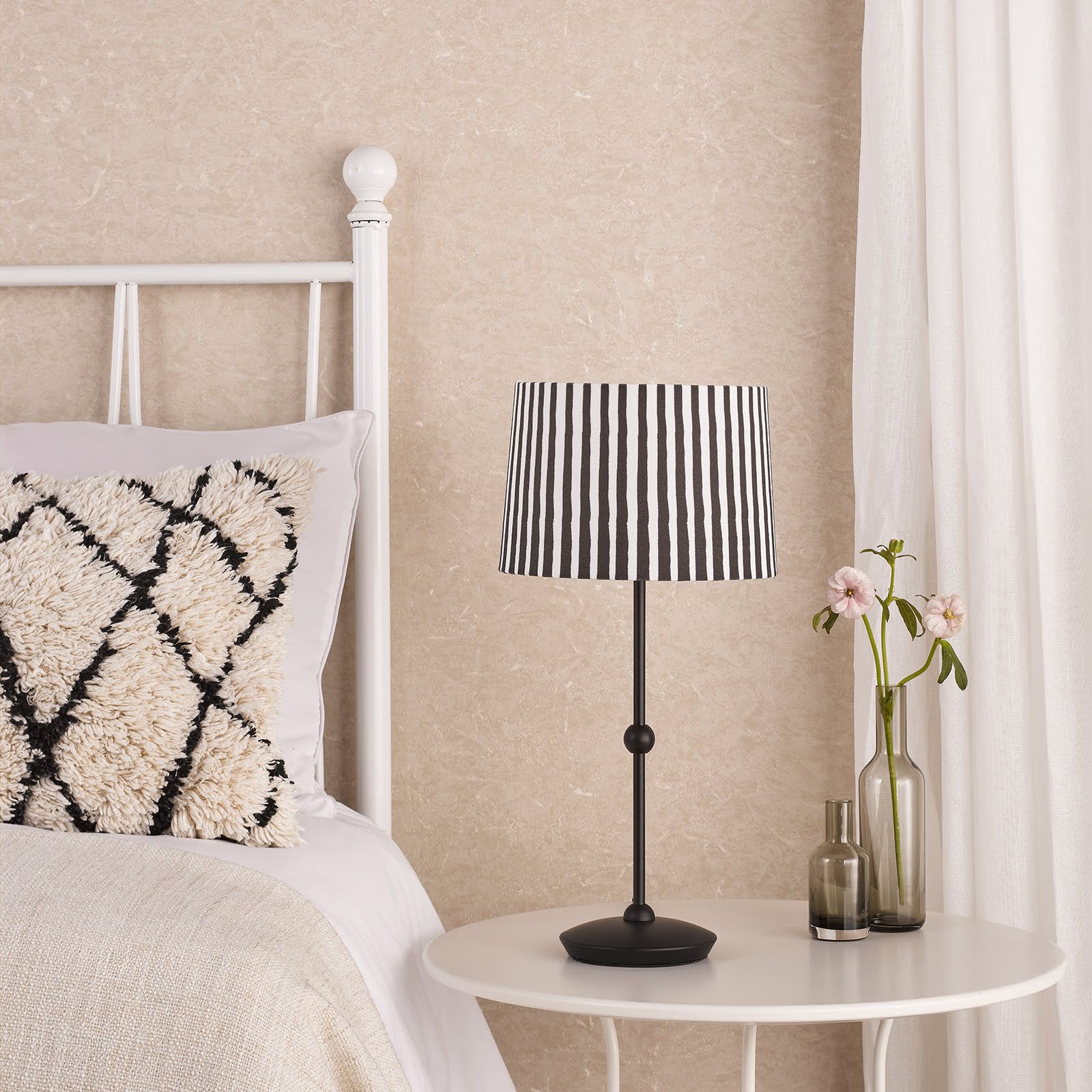 Illuminate your space with understated elegance using the Sosa table lamp from Dar Lighting. This unassuming contemporary table lamp boasts a sleek matt black finish that effortlessly complements any decor. The matching striped shade adds a touch of visual intrigue, creating a cohesive look that's both stylish and functional. With its versatile design, the Sosa table lamp is equally at home in your living room, bedroom, or home office. The convenient inline rocker switch makes operation a breeze, allowing you to easily create the perfect ambiance. Whether you're reading, working, or simply relaxing, this Dar Lighting Sosa table lamp provides the ideal blend of form and function for your modern living space.