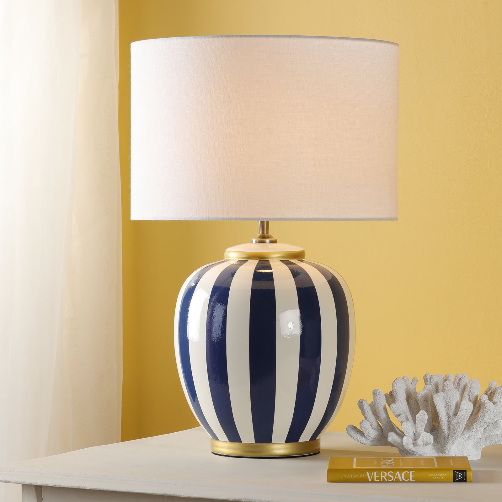 The Circus Table Lamp adds a playful yet sophisticated charm to your interiors. Featuring a handcrafted ceramic base adorned with bold blue and white stripes, it evokes the excitement and spectacle of the big top. Antique brass accents provide a touch of golden elegance, making this lamp a perfect blend of whimsy and refinement. Hand-painted and unique, it’s a true statement piece for any room. Whether flanking a sofa or placed as a standalone feature, the Circus Table Lamp brings a touch of artistry and fun to your decor, guaranteed to captivate attention.