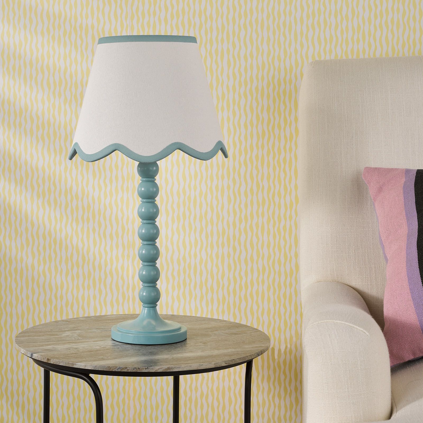 Add a splash of style to your space with the Spool Table Lamp paired with the Poma Shade – a perfect harmony of playful design and natural elegance. The lamp’s sculptural bobbin-style stem, finished in a striking blue hue, brings a bold pop of colour and contemporary character to your interior. Topped with the Poma Shade in smooth natural linen with a blue scalloped edge, it softens the look beautifully while adding a touch of Boho charm. Ideal for bedside tables, living rooms, or cosy reading nooks, this combination offers an inviting glow and timeless appeal – a statement of effortless style and creativity.