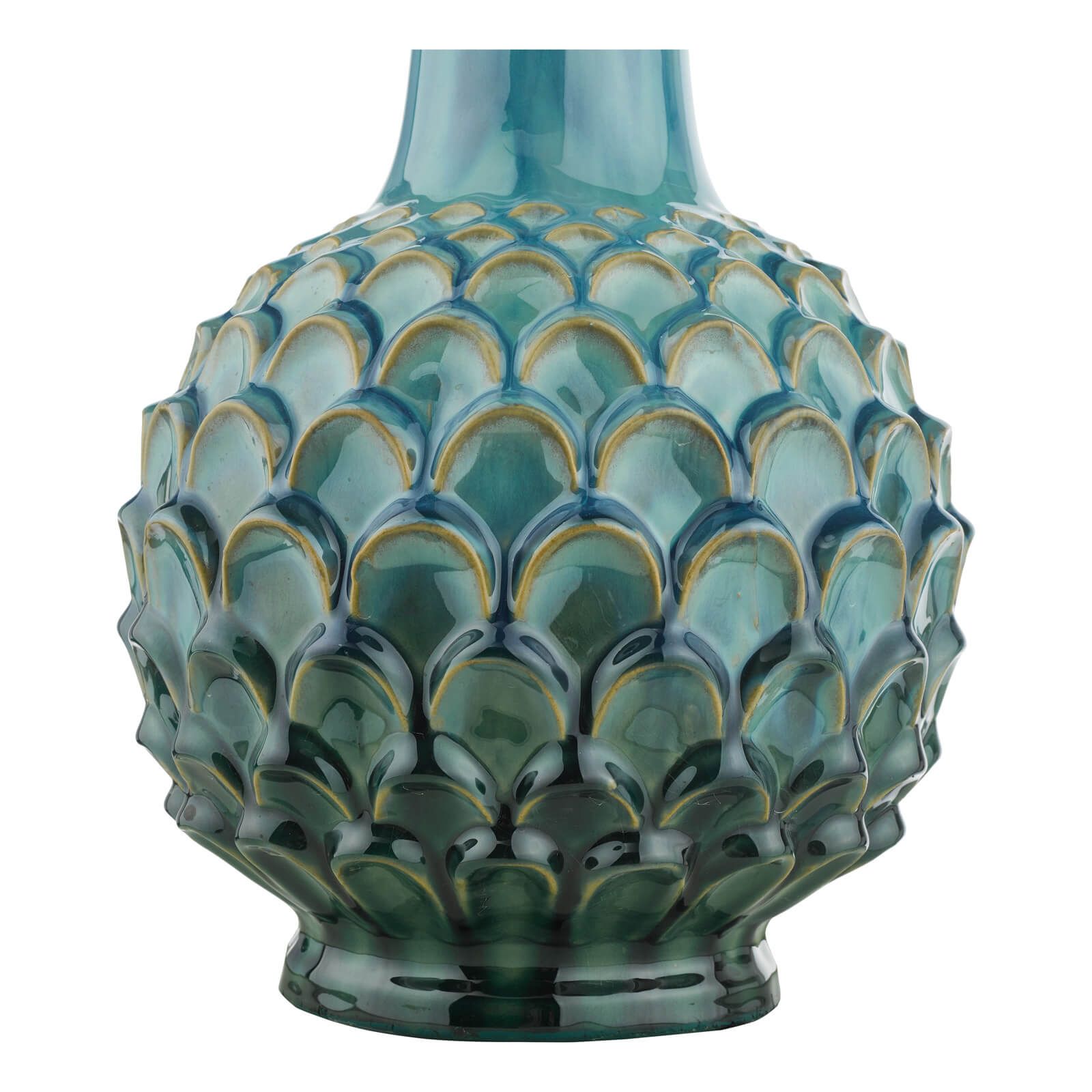 The Edlyn Table Lamp Blue Reactive Glaze is an artichoke-inspired table lamp with antique brass metalwork and a hand-made white reactive glaze finish that subtly changes colour in natural light. The Edlyn is sold complete with a complimentary brown faux silk shade and features a braided cable with an inline rocker switch.