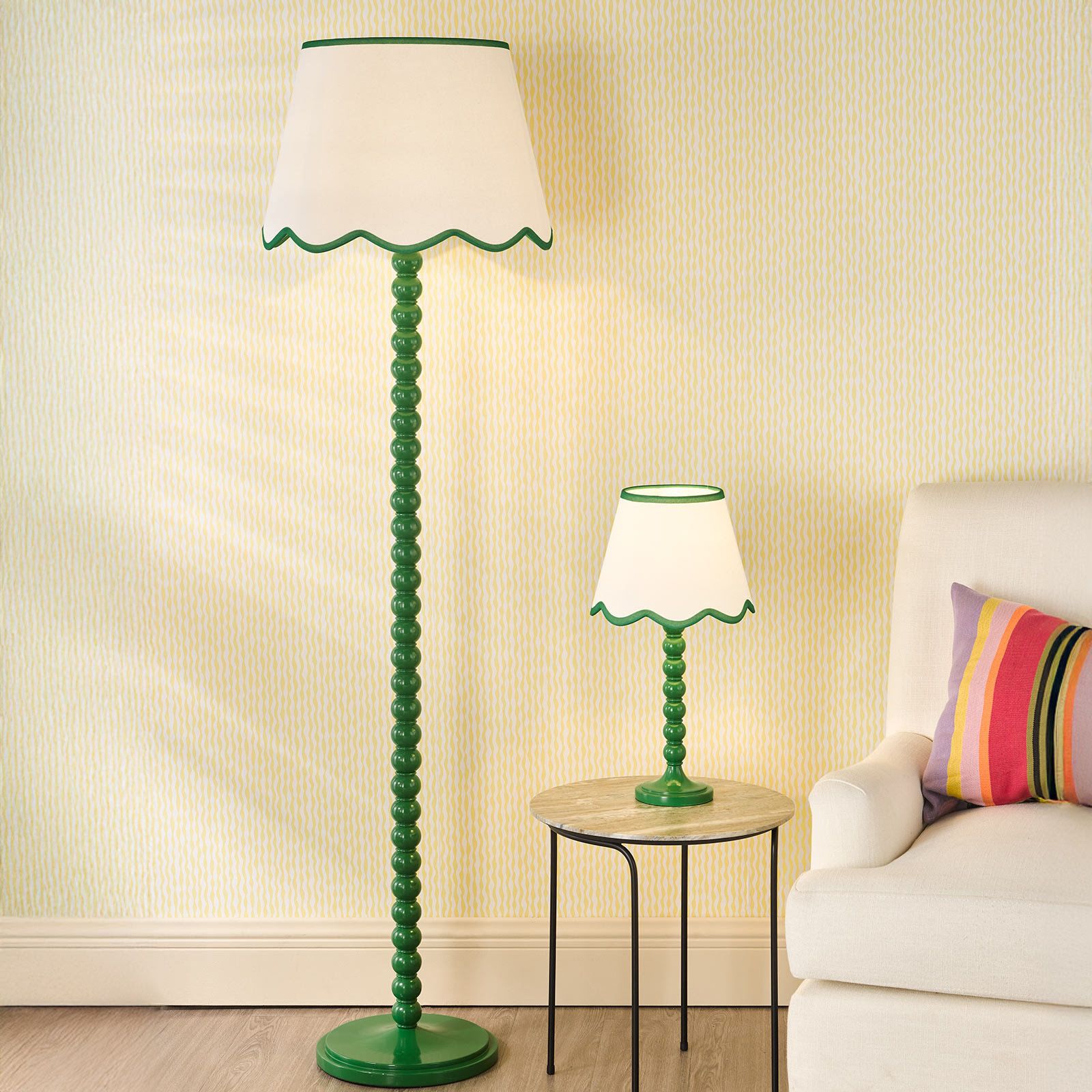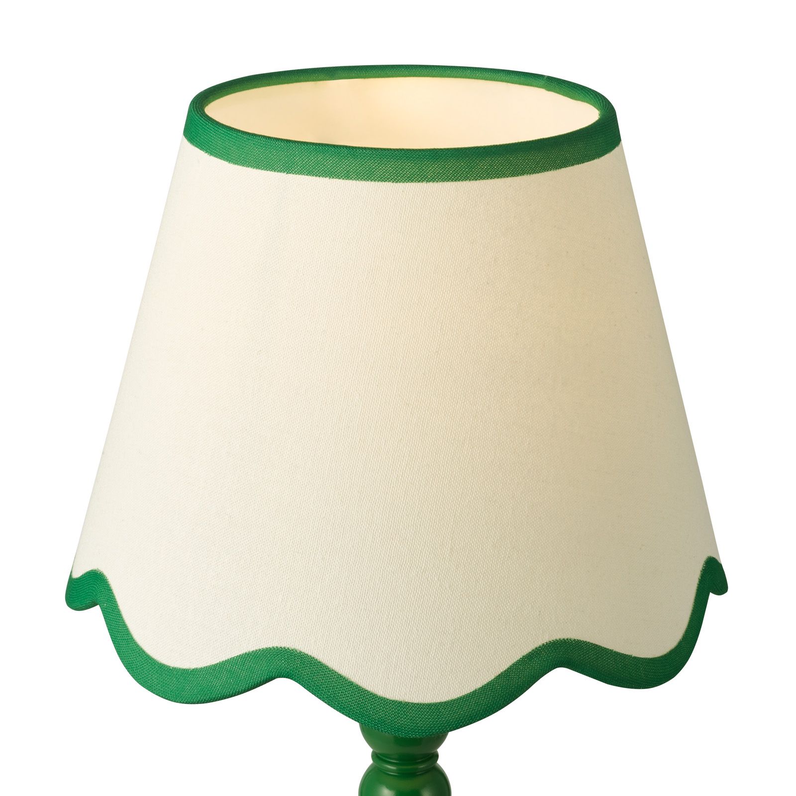 Add a splash of style to your space with the Spool Table Lamp paired with the Poma Shade – a perfect harmony of playful design and natural elegance. The lamp’s sculptural bobbin-style stem, finished in a striking green hue, brings a bold pop of colour and contemporary character to your interior. Topped with the Poma Shade in smooth natural linen with a green scalloped edge, it softens the look beautifully while adding a touch of Boho charm. Ideal for bedside tables, living rooms, or cosy reading nooks, this combination offers an inviting glow and timeless appeal – a statement of effortless style and creativity.