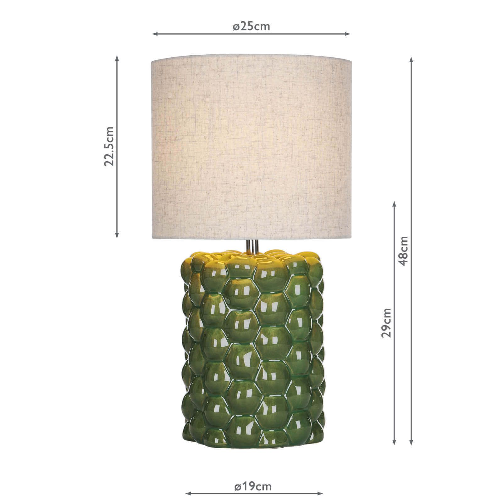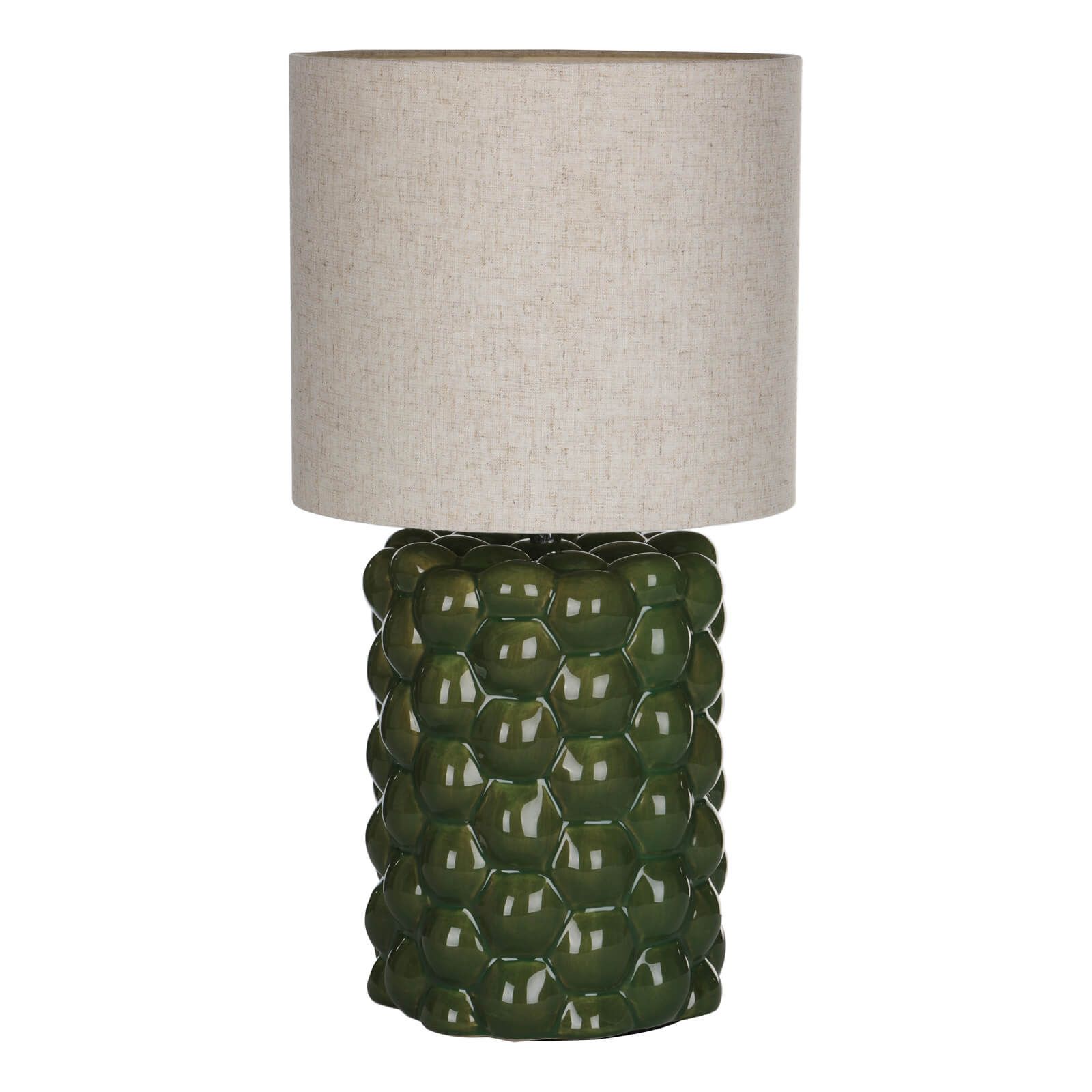 The playful Jayden Table lamp sports a green reactive glaze finish with a bobbled design for a distinctly mid-century modern vibe. Topped with a natural linen shade, the Jayden radiates warm, ambient lighting that's equally at home illuminating a cosy living room nook or casting a soft glow over your bedside reading material.