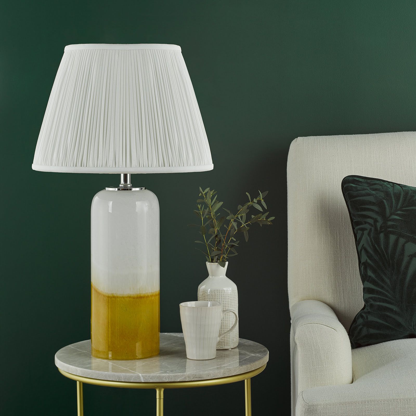 Illuminate your space with the Deandra Table Lamp, a stunning glass table lamp that's as much a work of art as it is a light source. Crafted from yellow and white art glass, each base is mouth-blown by skilled artisans, ensuring no two are exactly alike. This bedside lamp features a twin switch and a lit base, perfect for creating a cosy ambience in your bedroom or living room. The Deandra Table Lamp comes complete with a white pleated shade to complete the look. Whether you're reading in bed or setting the mood for a relaxing evening, this versatile lamp adds a touch of handcrafted elegance to any room.