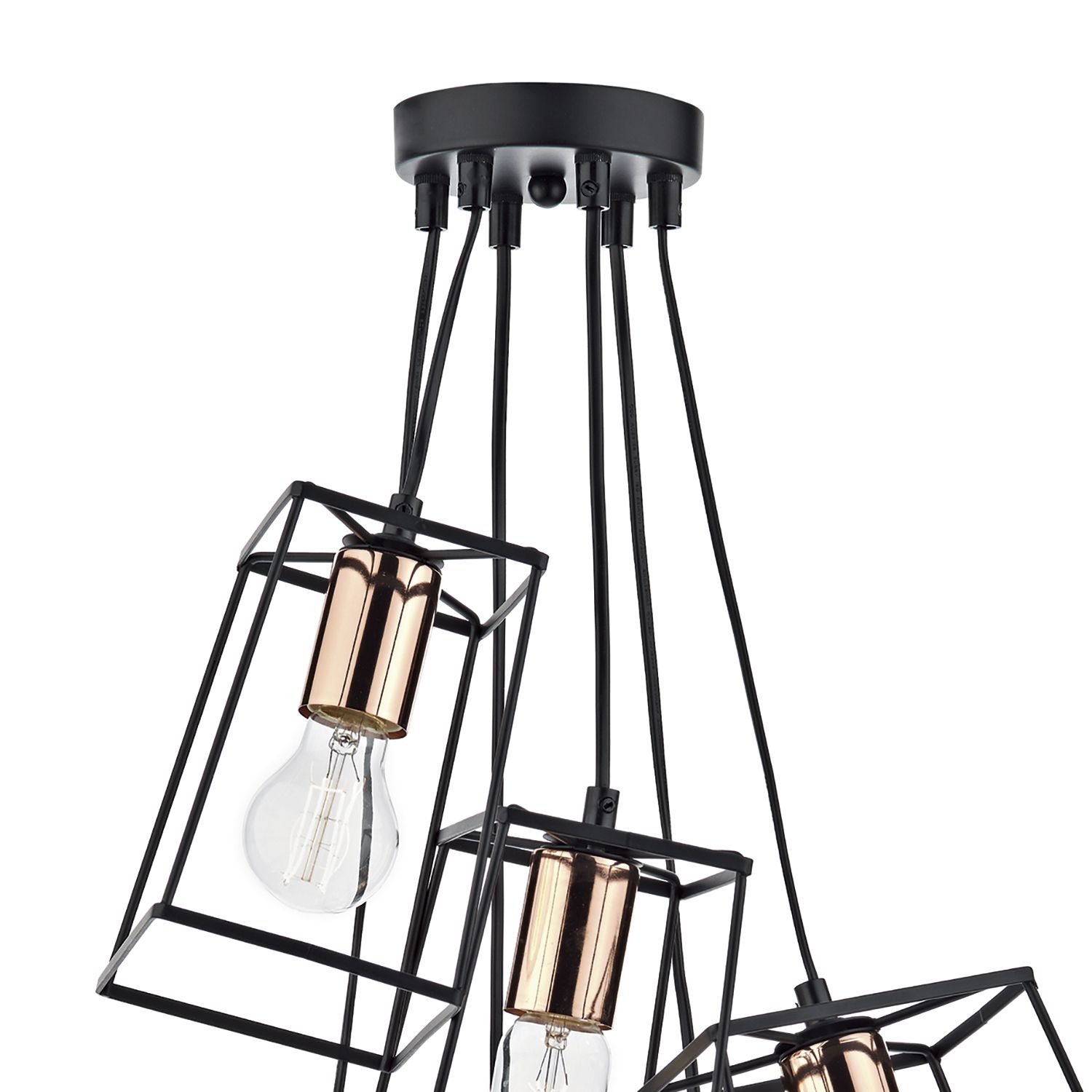 Create a sense of drama with the Tower cluster cage pendant from dar Lighting, which features six separately suspended cascading wire frame boxes in matt black with bright copper detail on the lampholders. There are three small box shades (H18, W18, D12cm) and three large box shades (H24, W24, D14cm).