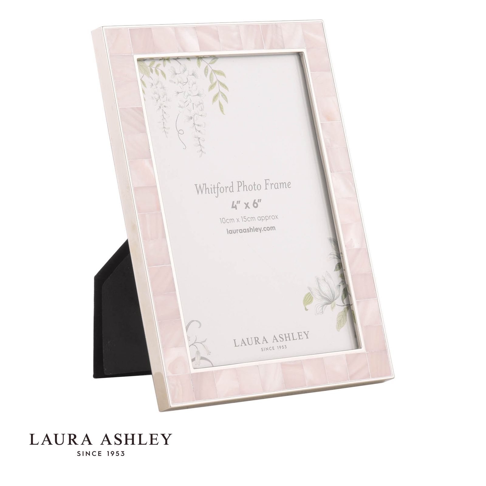 Cherish life's special moments forever with the Laura Ashley Whitford 4" x 6" photo frame in pale pink. This exquisitely crafted frame exudes quiet sophistication with its mother of pearl inlays and soft pink hue. Whether displaying an elegant wedding portrait or a candid snapshot from a milestone celebration, the Whitford photo frame lends a touch of timeless British style to your most treasured memories. Its compact size makes it equally suited for a cosy mantel display or among other treasured keepsakes adorning your shelves. With Laura Ashley's heritage of quality craftsmanship, this photo frame elevates any space with effortless femininity.